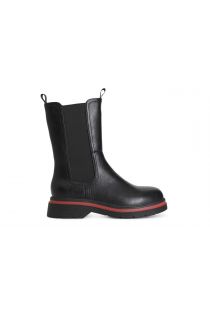 Women's black leatherette 3/4 boot. side stretch panel to make them easier to put on. rubber sole with red band 40 mm heel.