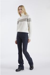 Soft denim canvas flared trousers with particular zigzag stitching in contrasting yarn. All embellished with a precious painted button