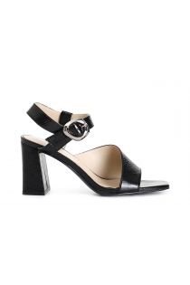 Asymmetric patent leather guilda model sandals. adjustable ankle strap with buckle. upper lining and insole are in leather. 8.5 cm high wide heel. elegant stylish and formal shoe.