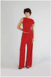 Elegant asymmetrical sleeveless top in superstretch fabric with drawstring at the shoulder and draping on the side.