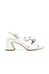 Sandals with asymmetrical napa leather upper and three-ball decor accessory. a shoe that can be worn all day long thanks to its 55 mm-high broad-base heel and comfortable base.