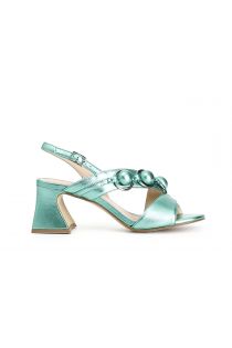 Sandals with asymmetrical patent leather upper and three-ball decor accessory. a shoe that can be worn all day long thanks to its 55 mm-high broad-base heel and comfortable base.