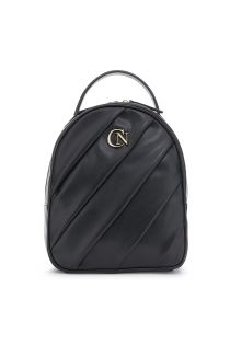 Faux leather backpack with pleated detail on the front, zip pocket on the back, padded handle, metal Café Noir logo, adjustable shoulder straps with buckle.