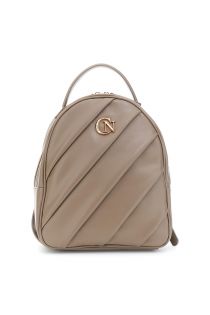 Faux leather backpack with pleated detail on the front, zip pocket on the back, padded handle, metal Café Noir logo, adjustable shoulder straps with buckle.