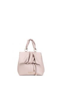 Semi-rigid backpack with soft pleated flap and twist handle.