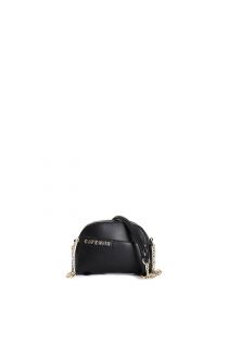 Shoulder bag with asymmetric pocket design and applied lettering chain shoulder strap attachment and padded shoulder strap for maximum comfort and elegant style