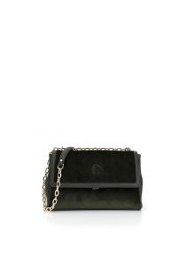 Velvet flap bag with embossed logo. double compartment and zipped inner pocket. metal plate with cafènoir logo on the side. shoulder strap with sliding chain for carrying on the shoulder.