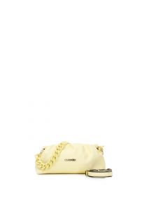 Elongated bag with soft pleats with snap fastener opening. with shoulder strap to be carried on the shoulder.