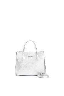 Bag with tubular handles in metallic leather. flap closure and internal zip partition. removable shoulder strap