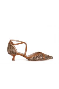 Raffia effect décolleté with crossover on the instep and patch on the back. slim shape. leather insole. 5 cm spool heel. footwear that combines elegance and modernity. ideal for adding a sophisticated touch to any outfit.