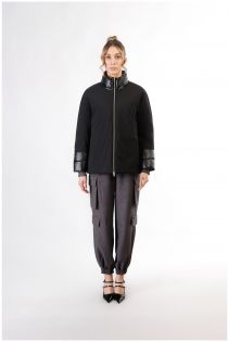 Short bi-material hood-style down jacket. collar and sleeve bottom in ultralight fabric. to be worn to go to work when bad weather strikes for a walk in the open air with family or friends.