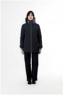 Down jacket with fixed hood in contrasting fabric made of soft shell fabric. screwed model with a feminine look. double slider zip closure. to be worn to go to work when bad weather strikes for a walk in the open air with family or friends.