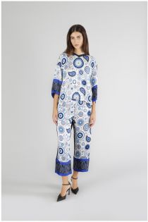 Bi-material box-fit sweatshirt with elbow-length sleeves. the front and sleeves are made of a printed viscose satin and the back is made of jersey.