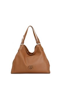 Large shopper in hammered effect material. applied leather-effect logo with hand-stitching and edging at the sides. super capacious can be worn two ways (internal drawstring). magnetic clasp.