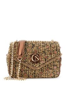 Boucle fabric shoulder bag with flap and sequin appliqué. Internal zip closure. Back pocket. Chain shoulder strap and metallic trim. Padded shoulder strap with metal logo and fabric fringe.