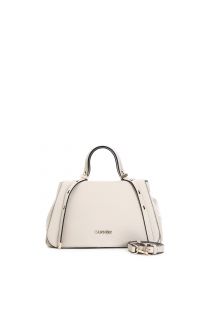 Bowling bag with large flap buckle-type handle with decorative metal tips and holes secured at the top by metal loops.