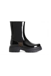 Women's brushed leatherette ankle boot with side stretch panel on the leg embellished with a pony skin insert. the insole is leather.