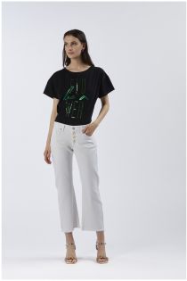 Bootcut fit cropped jeans in bull denim stretch fabric. exposed buttons and frayed raw cut hems.