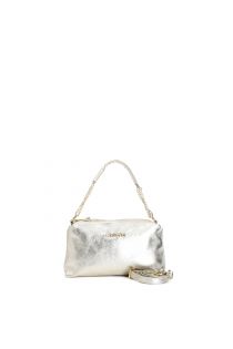 camera bag in metallic leather with chain handle with handle and tassel light gold