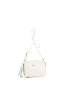 camera bag in textured leather with shoulder strap with snap hooks and tassel beige