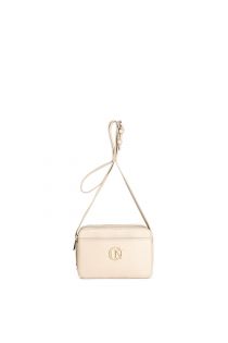 Camera bag in genuine hammered leather with front pocket and metal logo. adjustable shoulder strap with buckle for a practical and elegant look.