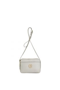 Camera bag in genuine hammered leather with front pocket and metal logo. adjustable shoulder strap with buckle for a practical and elegant look.