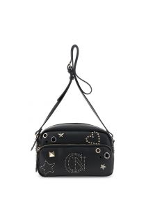Faux leather camera bag with decorative studs and contrasting rivets. Front zip pocket and adjustable shoulder strap for a bold, contemporary look.