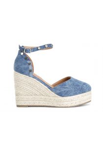 Canvas sandals on 10.5 cm rope wedge and 3.5 cm platform. ankle strap. leather insole. shoe closed at the front and back. golden studs on the top and on the strap.