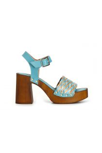 clogs with wooden heel and decorative two-tone woven raffia strap multi turquoise