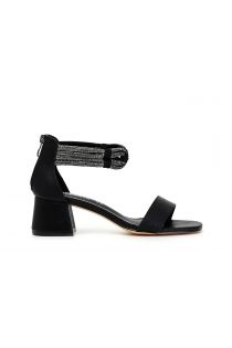 Closed back sandals with anklet in micro rhinestones on medium heels.