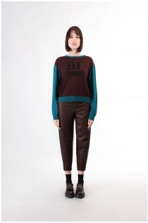 Sweater in warm and soft wool blend yarn. stockinette stitch and jacquard workmanship for our "be noir" slogan embellished with expertly applied rhinestones. available in a very trendy two-tone variant and two solid color variants.