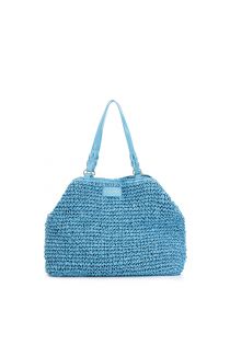 crocheted tote with coloured heart charm with raffia border aquamarine