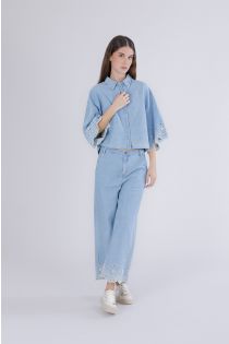Cropped denim shirt with a classic collar and front closure. the embroidered short sleeves add a feminine and sophisticated touch. perfect for casual-chic summer looks and modern combinations. the model is 175 cm tall and wears a size s. fit: regular.