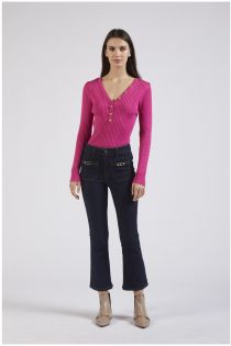 Super-stretch denim jeans with cropped flare fit. special patch pockets on the front are finished with personalised plates.