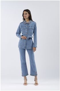 Field jacket made of comfort denim. the collar is embellished with an exclusive rich embroidery of multi-coloured rhinestones. long sleeves
