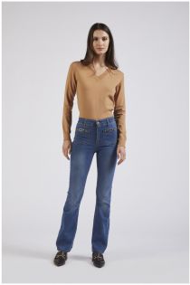 Super-stretch denim jeans with a flare fit. special patch pockets on the front are finished with personalised plates.