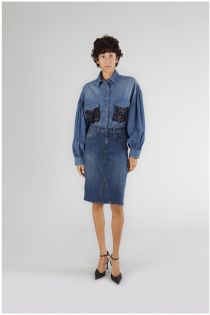 Denim midi skirt made of superstretch canvas and slit on the back of the skirt. garment that is suitable for casual occasions with a t-shirt and flat shoes.