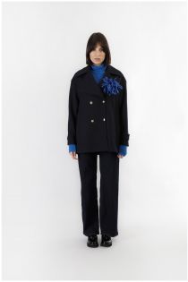Double-breasted peacoat with wide collar and golden buttons. an essential and versatile wardrobe piece it goes with all styles.