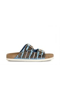 Flat slipper sandals with double buckle with rhinestone and sequin motif. leather lining. 2.4 cm high wedge. a cross between boho and ethnic style for a summer full of style