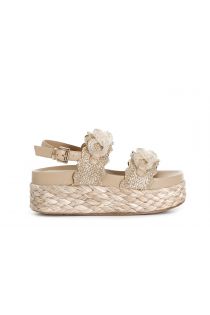 Colour block fisherman sandal with double woven raffia strap and transparent satin chain accessory. comfortable footbed and raffia-clad wedge.