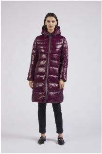 Bold down jacket with an up-to-date look. the belt at the waist makes it feminine. same material with two different finishes glossy and matt.