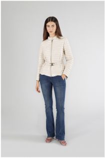 Spring down jacket with long sleeves with central zip and standing collar made of impalpable nylon with a shiny finish. there are also zips on the sleeves which have both a decorative and functional function. the front pockets closed with an invisible zip and the elastic belt make the garment more feminine.