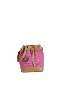 drawstring raffia bucket bag with leather trim and pendant fuxia/tan