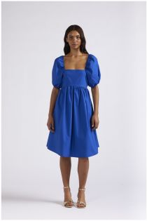A dress with a square neckline whose special feature is an evident lace-up plunge at the back. short balloon sleeves. dress made of cotton poplin.