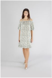 Knee-length dress in printed satin with off-the-shoulder bateau neckline. dress with a romantic and feminine style.
