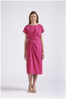 Dress with boat neckline and dropped shoulder made of cotton poplin. the asymmetrical pleats create an elegant draping at the front and give movement with a very original play of volumes.