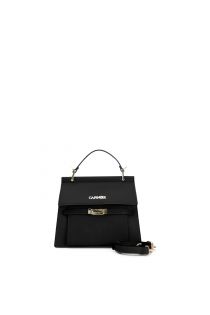Satchel made of different materials with flap and front pocket enhanced by a thin croc print strap.