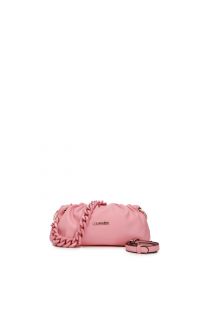 Elongated shape bag with soft pleats, opens with snap hinge, to be worn as a shoulder bag with its strap