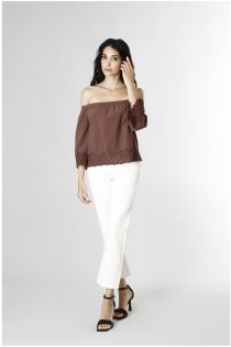 Cotton blouse with embroidery on hem and sleeves. large boat neckline.
