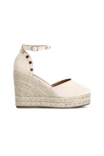Fabric sandals on a cord wedge and platform. fabric ankle strap. closed-front and -back shoe. gold studs on the reinforced heel and strap.